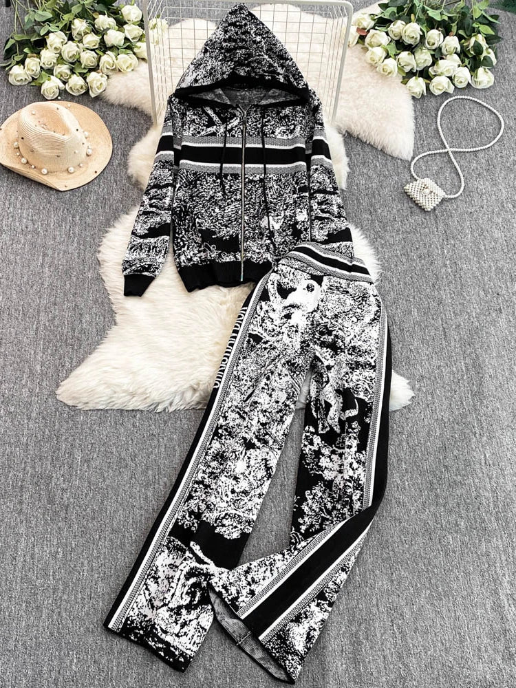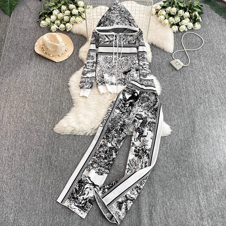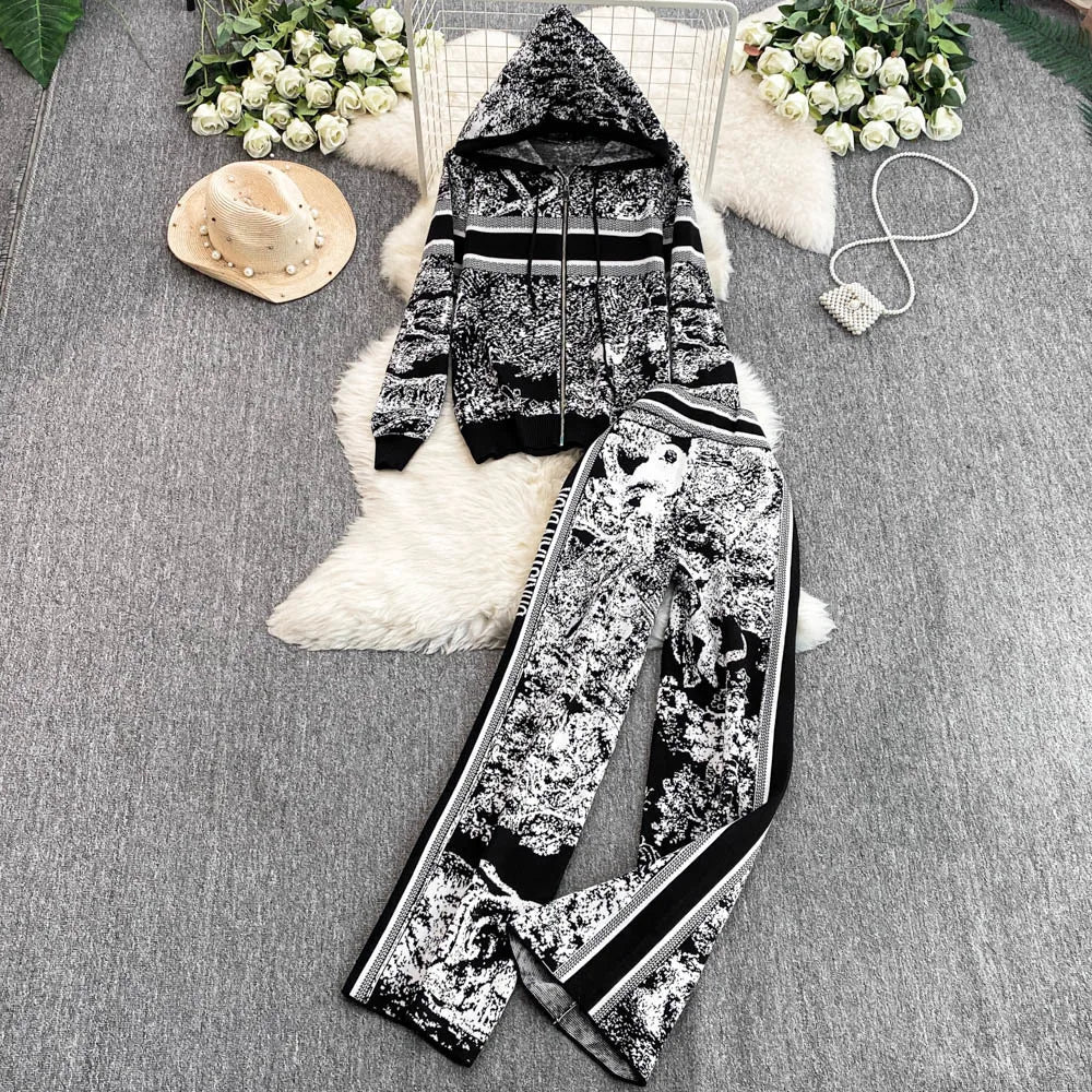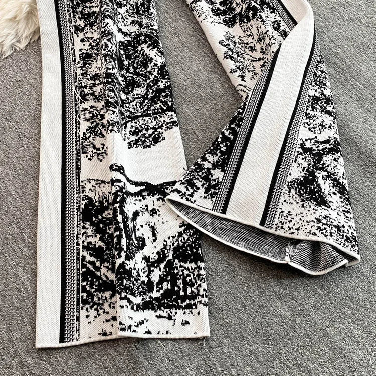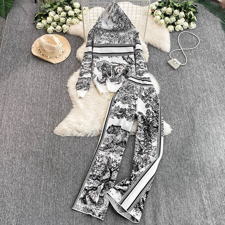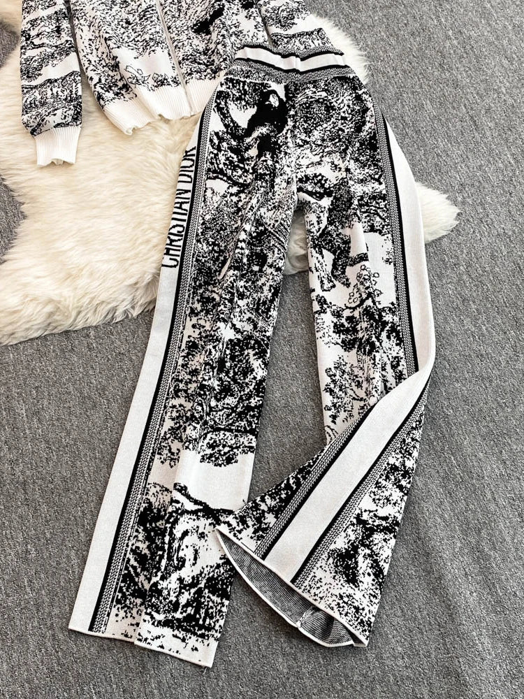 Autumn Winter New Temperament Crew Neck Slim Knit Sweater Loose Trousers Animal Pattern Printed Two-Piece Suit